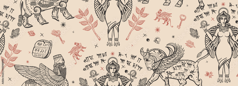 Ancient Sumerian Civilization Vintage Seamless Pattern Old School Tattoo Style Assyrian Culture Gilgamesh Legends Middle East History Background Mesopotamian Goddess Cuneiform Writing Ziggurat Stock Vector Adobe Stock